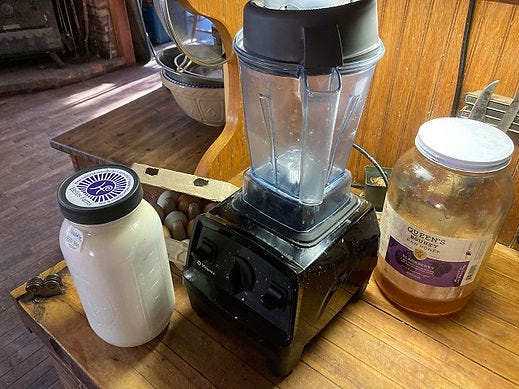 Adding raw eggs and raw honey to raw milk, makes raw eggnog. Since man can also live on raw chicken eggs alone (slurp down about a dozen or two a day), a quart of raw eggnog makes for a quick and VERY satisfying meal when you’re feeling depleted from a hard, hot, day of work on the farm or you’ve just risen and want to quickly start your day right.